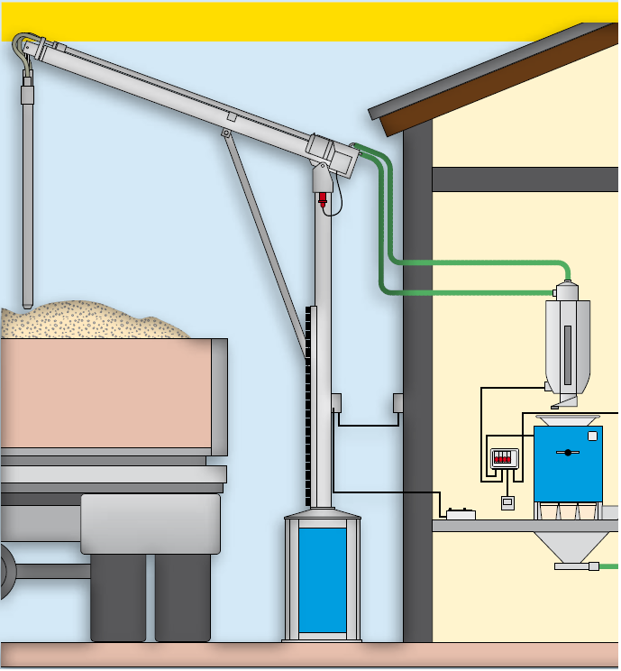 Der Entnahmespeer wird mit der Fernbedienung in das Produkt eingestochen. Dabei wird eine echte Querschnittsprobe in die innere Rohrkammer des Entnahmespeers hineingedrückt. Der Rakoraf arbeitet mit dem patentierten Convac-Umluftsystem. Auf das Produkt wird kein Saugeffekt ausgeübt. Es wird kein Leichtgut (z. B. Bruchkorn, Staub und Schmutz) von der unmittelbaren Umgebung mit angesaugt. Der Luftstrom erfasst nur die im Entnahmespeer vorhandene Probe und transportiert diese durch einen PVC-Schlauch zum Wiegeraum bzw. Labor. Dort wird die Probe im Probeabscheider (Sammelbehälter) von der Luft abgetrennt, entleert und steht zur Qualitätskontrolle bereit.